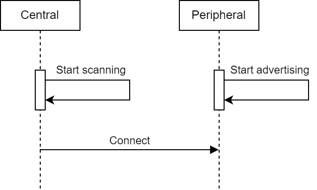 BLE introduces two roles of devices: the Central and Peripheral roles. A Central device scans nearby Peripheral devices and initiates the connection, while a Peripheral device advertises (broadcasts) and listens for connection requests. In this regard, a Central device can be thought of as a Wi-Fi Station while a Peripheral device can be thought of as a Wi-Fi Access Point.