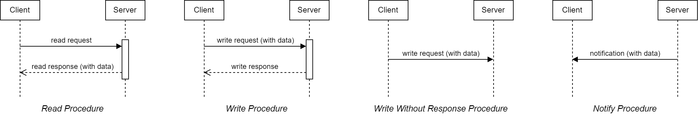 The Read procedure allows the device which discovered the service to request data. The device sends a read request and the device which provides the service sends back a read response with the data.