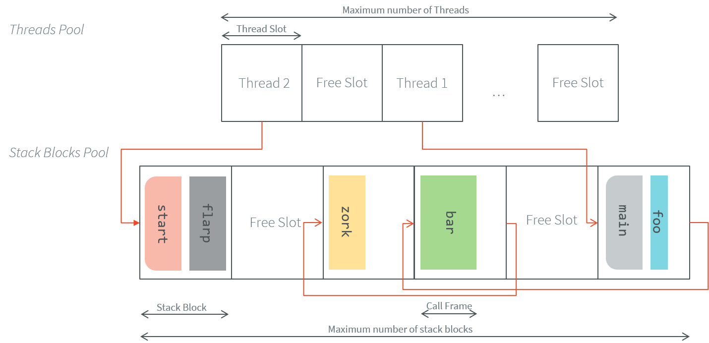 Stack Allocation: Each thread stack is composed of fixed-size blocks, which are allocated from a shared pool. This approach ensures efficient memory reuse and eliminates fragmentation during execution. The Application developer defines the number of blocks in the pool and the size of each stack block.