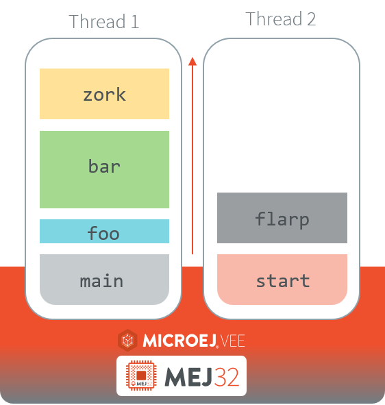 The following figure illustrates an example of thread execution, showing each thread with its associated stack of call frames: