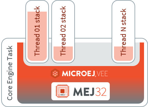 The Core Engine implements a multi-threaded environment without relying on native OS capabilities. It includes a built-in scheduler and adopts a Green Threads model, enabling full control over thread management. This design ensures that the scheduling policy is entirely portable and remains independent of the underlying RTOS or operating system on which the Core Engine runs.