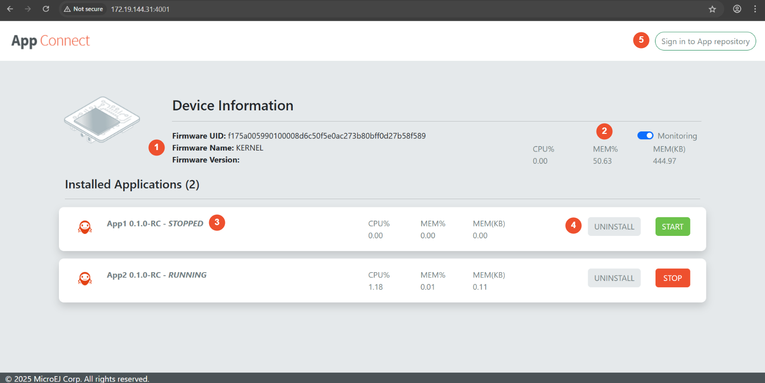 AppConnect is an embedded library designed to simplify the management of on-board Sandboxed Applications directly on the device. It provides services to install, start, stop, and uninstall applications, as well as to retrieve metadata about both deployed applications and the target device. The library includes a full-fledged HTTP server, providing a comprehensive REST API along with a web-based graphical interface.