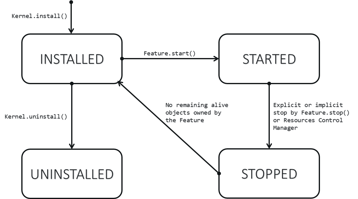 A Feature is an application “extension” managed by the Kernel. A Feature is fully controlled by the Kernel: it can be installed, started, stopped and uninstalled at any time independent of the system state (particularly, a Feature never depends on another Feature to be stopped). A Feature is optional, potentially not-trusted, maybe unreliable and can be executed without jeopardizing the safety of the Kernel execution and other Features.