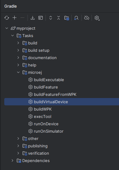 build.gradle.ktsfile, with themicroejApplicationconfiguration:dependencies { microejApplication(project(":myApplication")) }