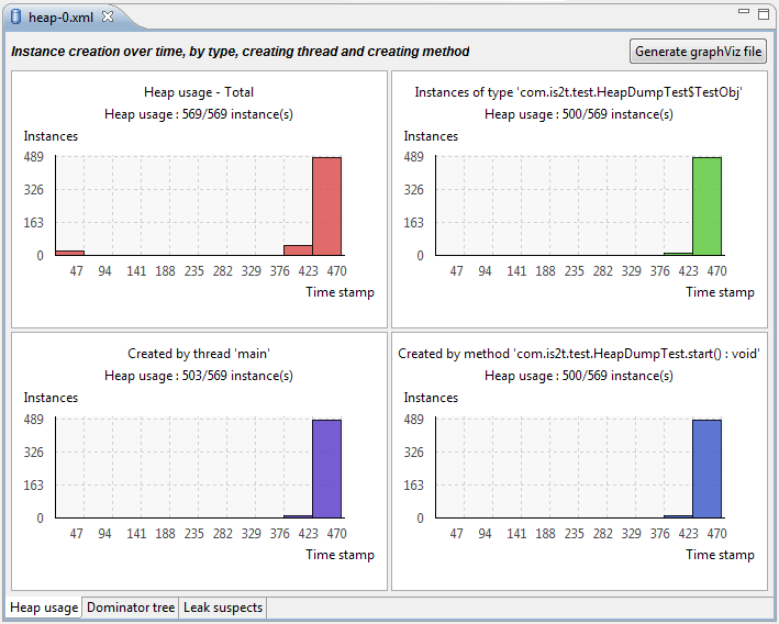 When an instance is selected in the Outline view the bottom-right chart is displayed. This chart shows the number of instances created in each time period by the method that created the selected instance.