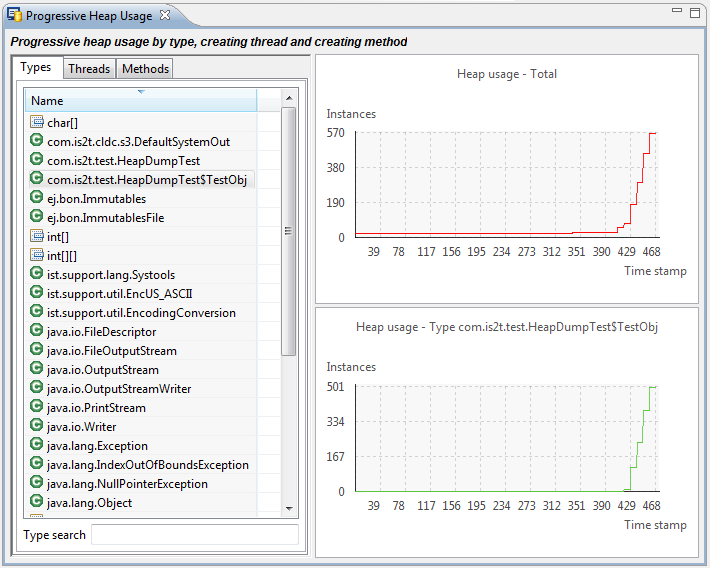 When a type or instance is selected in the Outline view the top-right chart is displayed. This chart shows the number of instances of the selected type created in each time period.