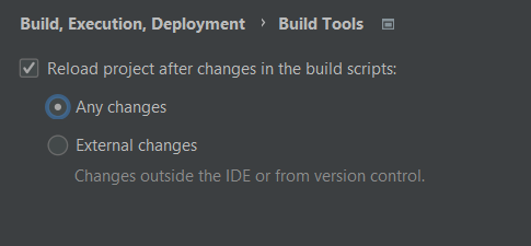 Check the Reload changes in the build scripts option and check the Any changes option.