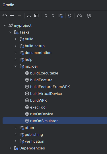 build.gradle.ktsfile, with themicroejApplicationconfiguration:dependencies { microejApplication(project(":myApplication")) }