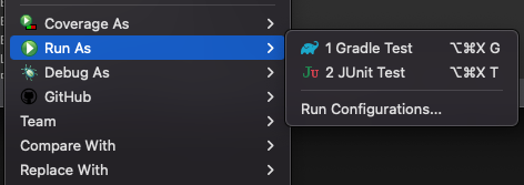 By right-clicking on a test class file, the menu proposes Gradle Test and JUnit Test in the Run As entry.
