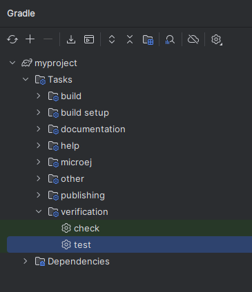 (1): configures all the testsuites of the project.(2): configures the built-intestsuite provided by Gradle. Use this testsuite to configure the tests on the Simulator.(3): declares that this testsuite uses the MicroEJ Testsuite Engine. By default, the MicroEJ Testsuite Engine executes the tests on the Simulator.(4): adds the dependencies required by the tests. The first line declares a dependency to the code of the project. The second line declares a dependency on theedcLibrary. The third line declares a dependency to the JUnit API used to annotate Java Test classes.