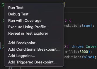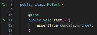 Test start buttons (represented as green triangle) may appear on the left side of class and method definitions.