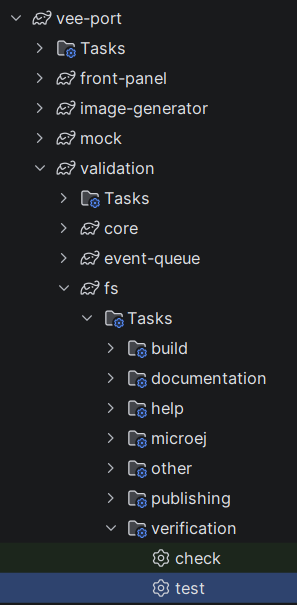 javaLibsRIP folder into the validation project folder and add them as file dependencies in the dependencies. The FS Testsuite contains only thecheckHelper.jarfile. It must be copied into the foldervee-port/validation/fsand the following line must be added:implementation(files(layout.projectDirectory.file("checkHelper.jar")).Add the following snippet of code in the