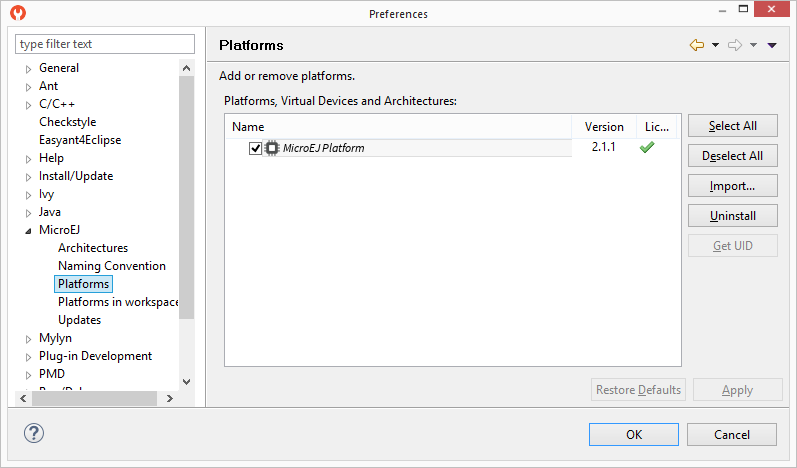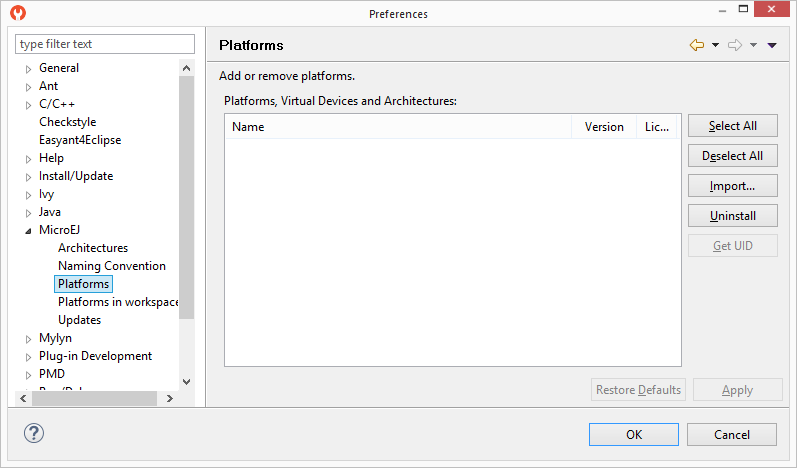 Open the Platform view in MicroEJ SDK, select Window > Preferences > MicroEJ > Platforms. The view should be empty on a fresh install of the tool.