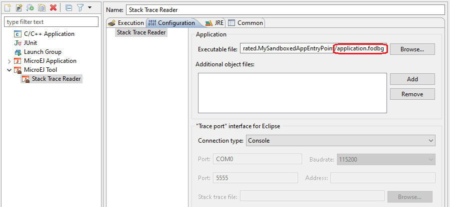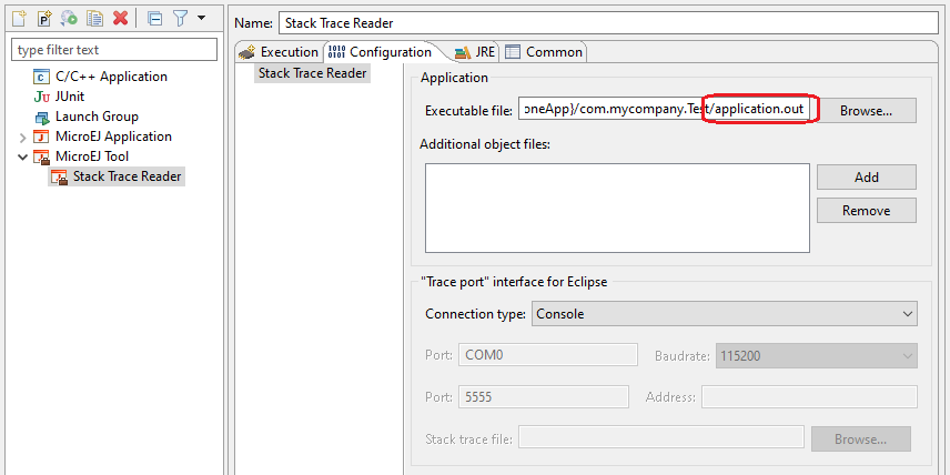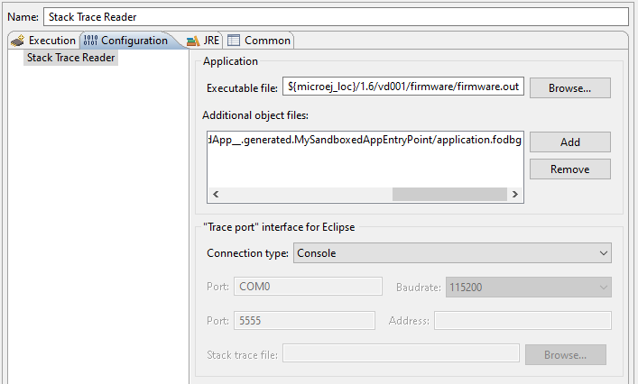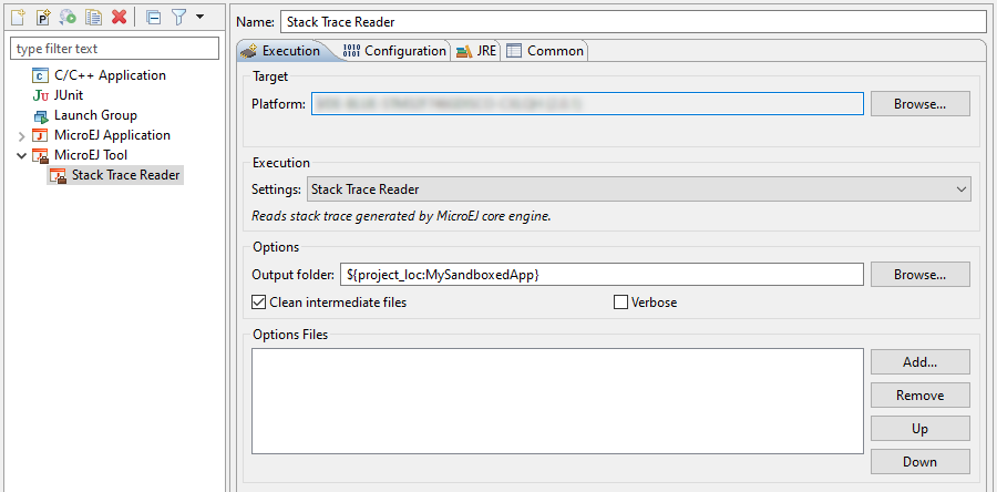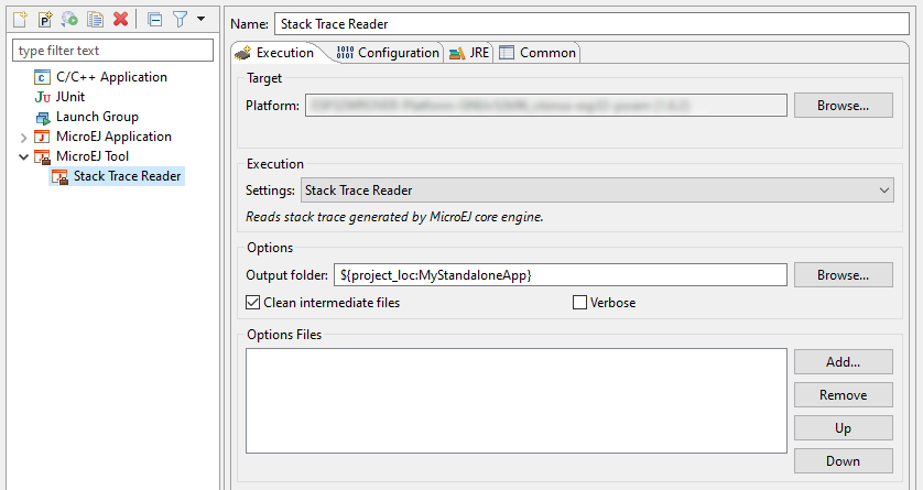 Create a new MicroEJ Tool configuration. In the Execution tab, select your target platform, then select the Stack Trace Reader tool. Set an output folder in the Output folder field.