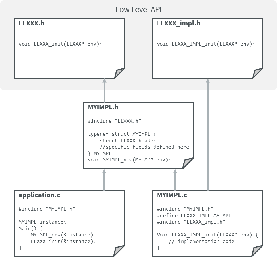 When a Low Level API allows multiple implementations, each implementation must have a unique name. At run-time there may be one or more instances of each implementation, and each instance is represented by a data structure that holds information about the instance. The address of this structure is the handle to the instance, and that address is passed as the first parameter of every call to the implementation.