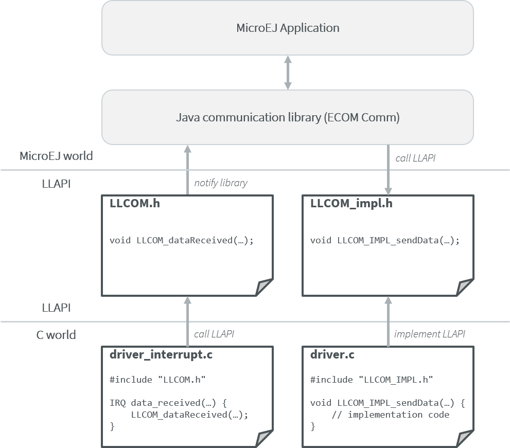 Each time the user has to supply the C code that links a VEE Port component to the target hardware, a Low Level API is defined. There is a standard pattern for the definition and implementation of these APIs. Each interface has a name and is specified by two header files: