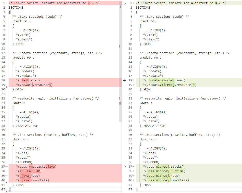 All references to section names in your BSP must be updated. This is usually only used in your linker script file, but section names are sometimes also hardcoded in the C Code. Here is an example of a GNU LD script highlighting the typical changes that must be made: