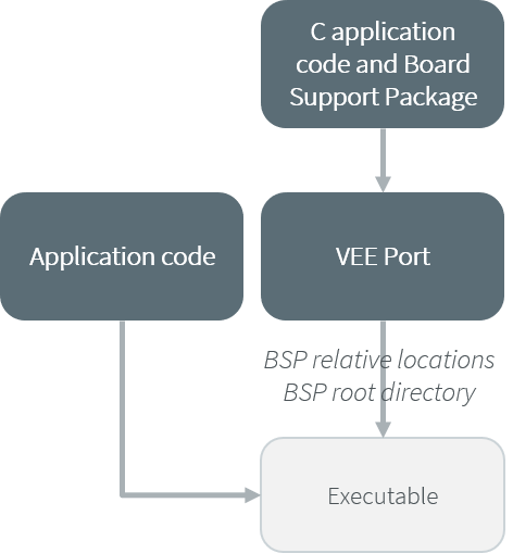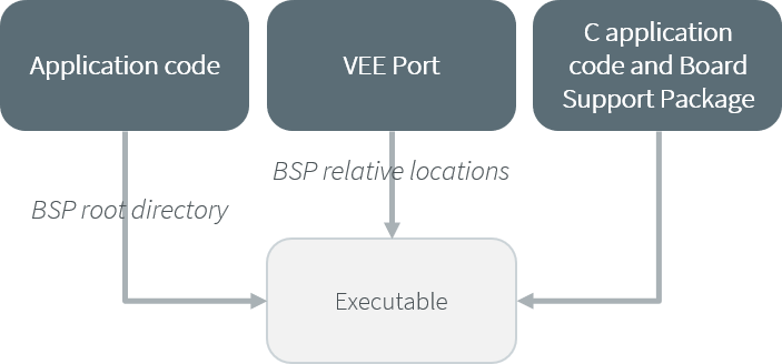 BSP connection is configured when building the VEE Port (relative locations within the BSP), as well as the BSP root location (absolute directory). No BSP connection configuration is required when building the Application.