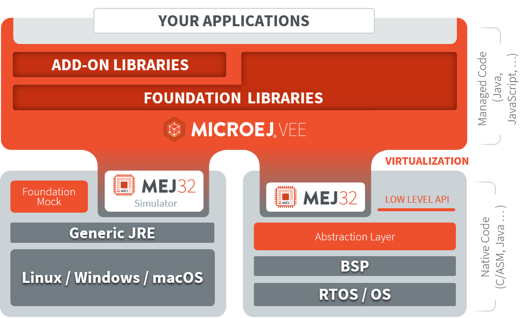 Foundation Libraries are MicroEJ Core libraries that provide core runtime APIs or hardware-dependent functionalities. They allow Managed code to call native code.