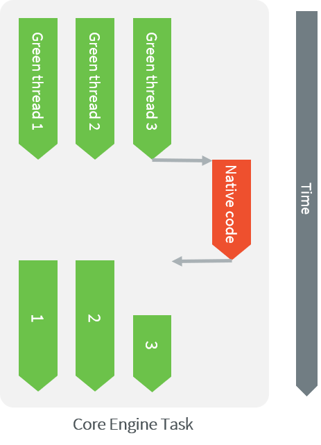 When a Java native method executes, it executes its C counterpart function. This is done using the CPU budget of the task that has started the Core Engine. While the C function executes, no other Java methods executes and the Core Engine cannot schedule other threads. The Managed world “waits” for the C function to finish.