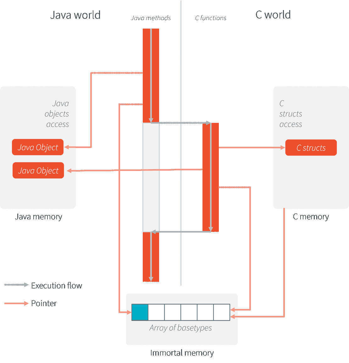 The following illustration shows both Java code and C code accesses to shared objects in the immortal space, while also accessing their respective memory. In C code, non-immortal arrays can only be accessed within the local scope of a native function.