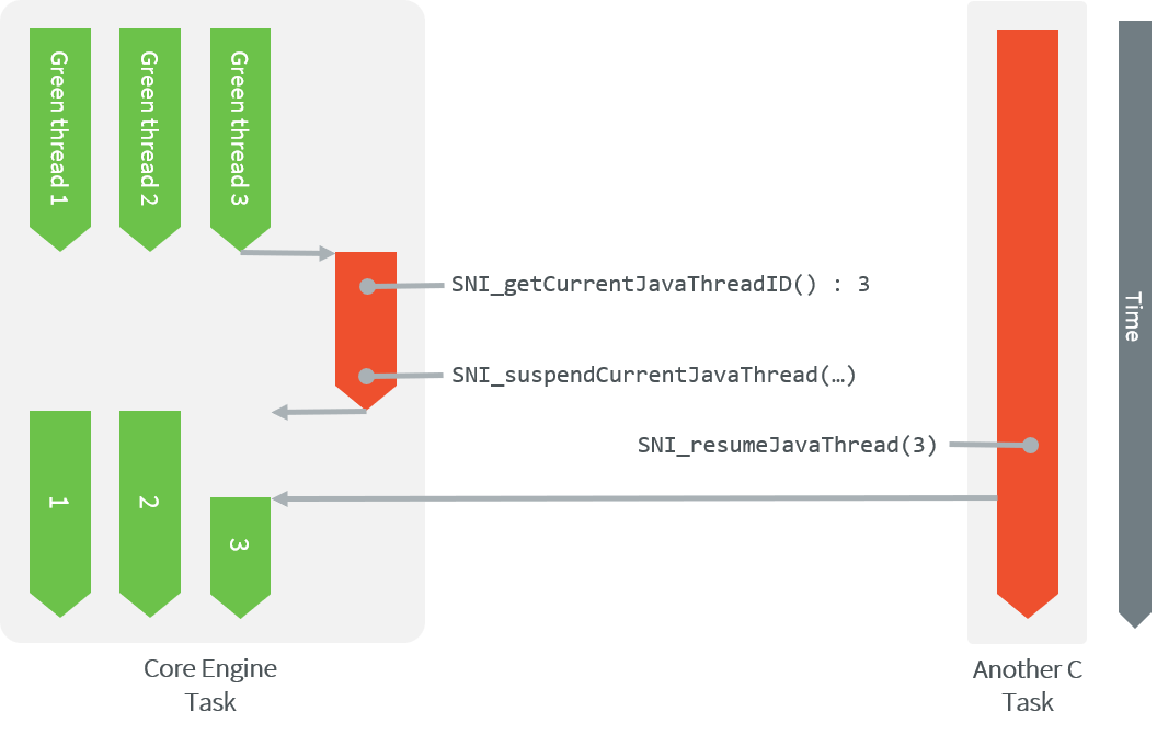 int32_t SNI_suspendCurrentJavaThread(int64_t timeout): Suspends the execution of the thread that initiated the current C call. This function does not block the C execution. The suspension is effective only at the end of the native method call (when the C call returns). The thread is suspended until either an task callsSNI_resumeJavaThread, or the specified number of milliseconds has elapsed.int32_t SNI_getCurrentJavaThreadID(void): Permits retrieval of the ID of the current thread within the C function (assuming it is a “native Java to C call”). This ID must be given to theSNI_resumeJavaThreadfunction in order to resume execution of the thread.int32_t SNI_resumeJavaThread(int32_t id): Resumes the thread with the given ID. If the thread is not suspended, the resume stays pending.