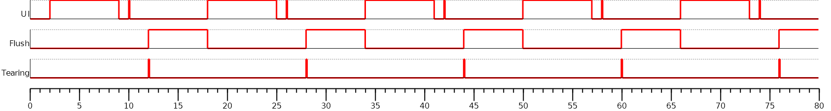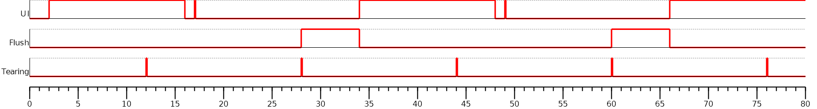 The display panel only shows complete frames; it cannot show partial drawings because the flush step is performed after all the drawings. The application cannot draw in the back buffer while the data is transmitted to the front buffer. As soon as the data is fully transmitted, the application can draw again in the back buffer.