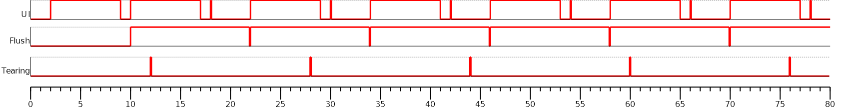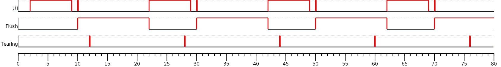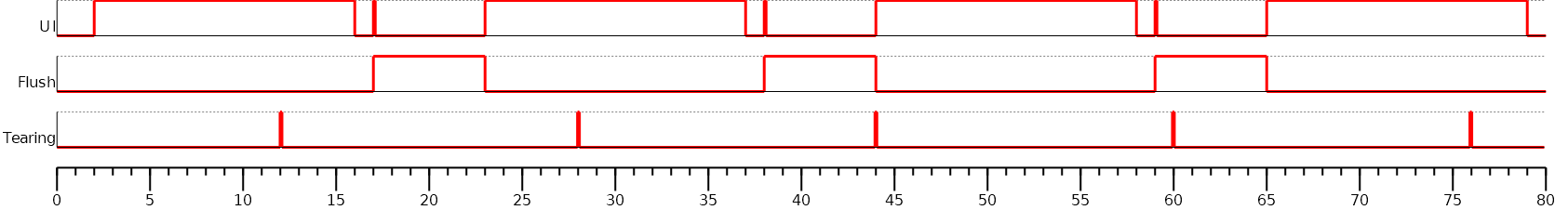 As soon as a transmission is started, the second buffer is freed. The Graphics Engine does not need to wait for the end of the serial data transmission: the application can draw immediately in the new back buffer. Note that the second flush has to wait the end of the first flush (the end of the transmission) before configuring and launching a new transmission.