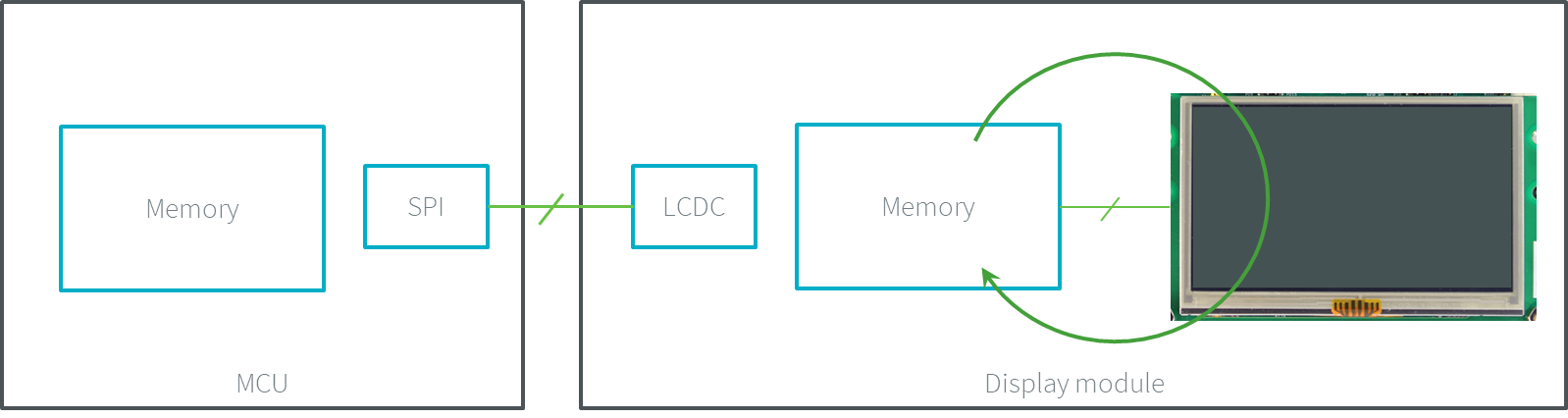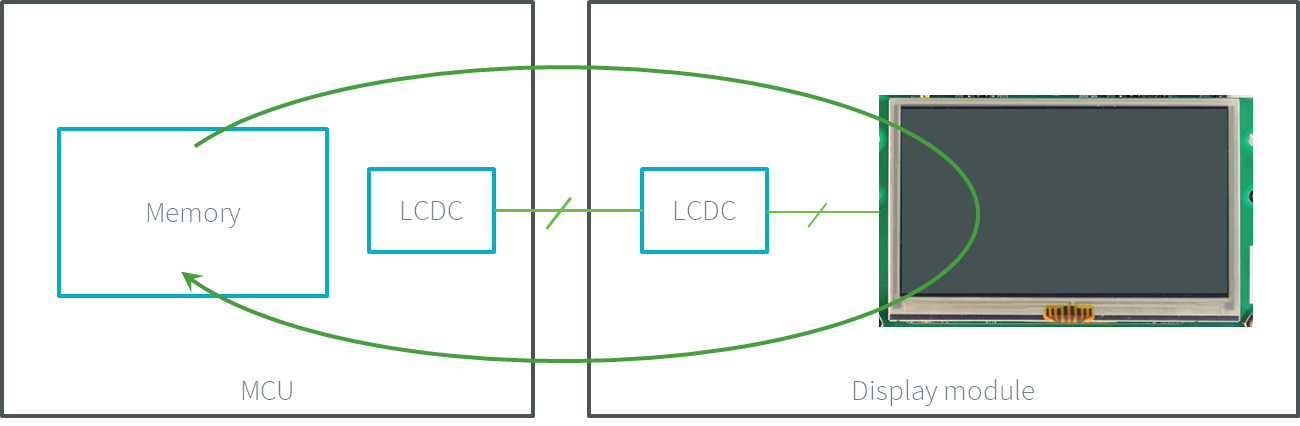 The MCU features an LCD controller that transmits the content of an MCU’s buffer to the display module. The display module doesn’t hold its memory. The LCD controller continuously updates the display panel’s content by reading the MCU memory data. By definition, this memory is addressed by the MCU: the MCU can write (and read) into it (the memory is in the MCU addresses range). This is the notion of mapped memory.