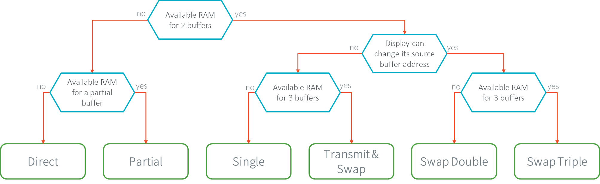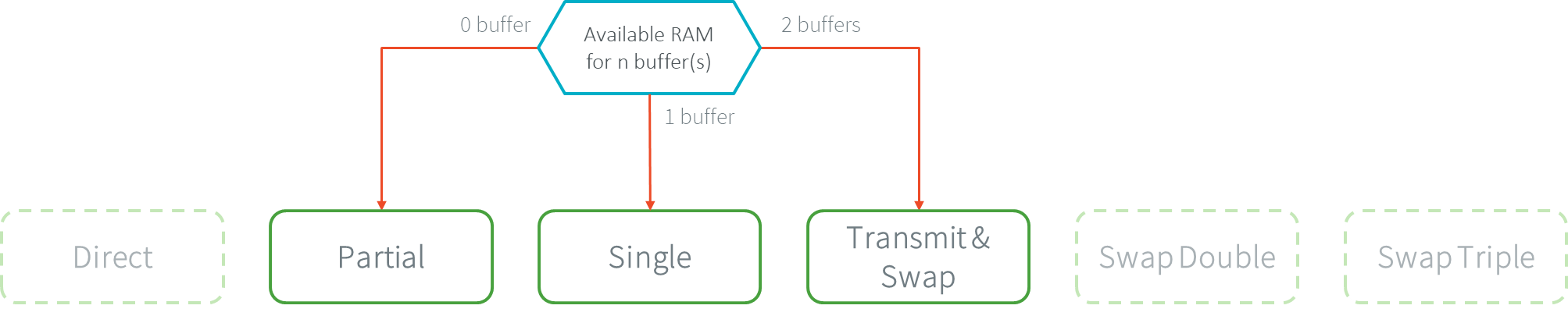 When the swap policy is not possible (the front buffer is mapped on a fixed MCU memory address), the policy single buffer can be used. Like the swap policy, this double buffering avoids flickering and inconsistent rendering: it is well suited to high-quality animations.