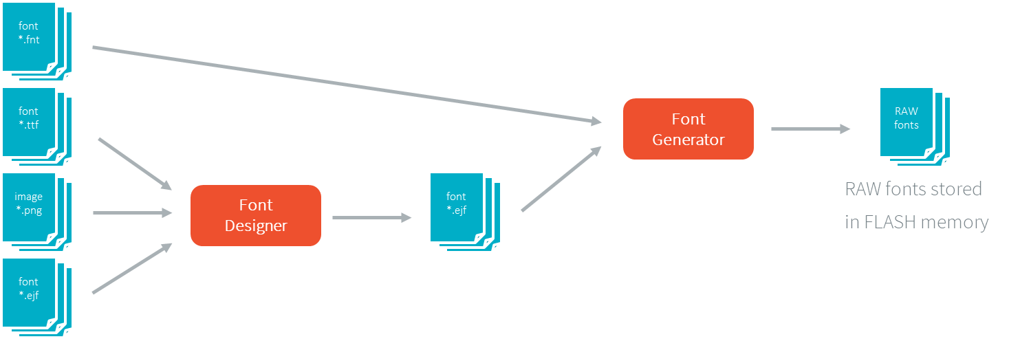 For EJF fonts, the fonts must be created and edited with the Font Designer before being integrated as resources by the Font Generator and loaded by the Font Loader at runtime.
