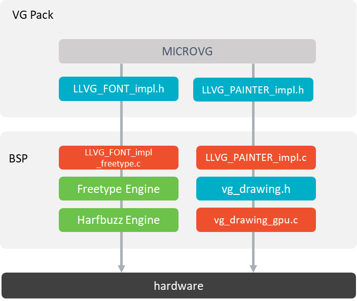 • MicroVG library calls the BSP functions through the header files LLVG_FONT_impl.h and LLVG_PAINTER_impl.h.
