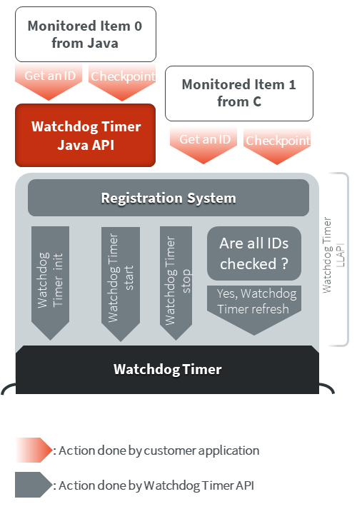 The checkpoint registration system allows the user to add checkpoints monitored by the hardware watchdog timer. Each checkpoint registered by the Watchdog Timer API must attest their activity before the watchdog timeout, otherwise a hardware reset is performed. The high level diagram below summarizes interactions between the user application, the Watchdog Timer API and the Watchdog timer.