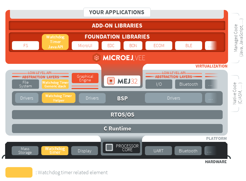 The WatchdogTimer Foundation Library provides a way to handle hardware watchdog timer. A watchdog is particularly useful if you want to monitor different items of your software system during the runtime. The figure below shows watchdog elements at each level of a MicroEJ project: