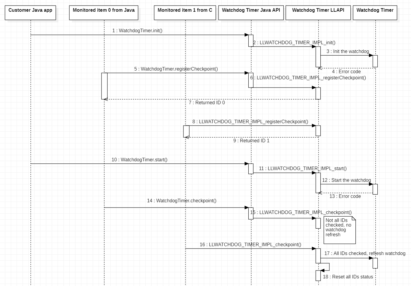The Watchdog Timer Low Level API provides a set of functions with the same usage as in Java code. Here is the list of the watchdog Low Level API functions: