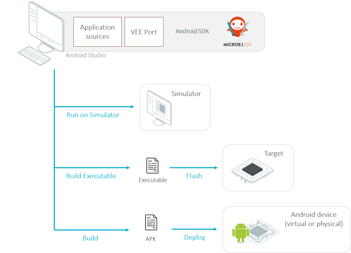 Below is a general overview of the workflow when developing a product that targets both MicroEJ and Android-powered devices.