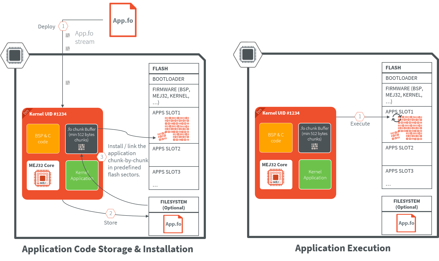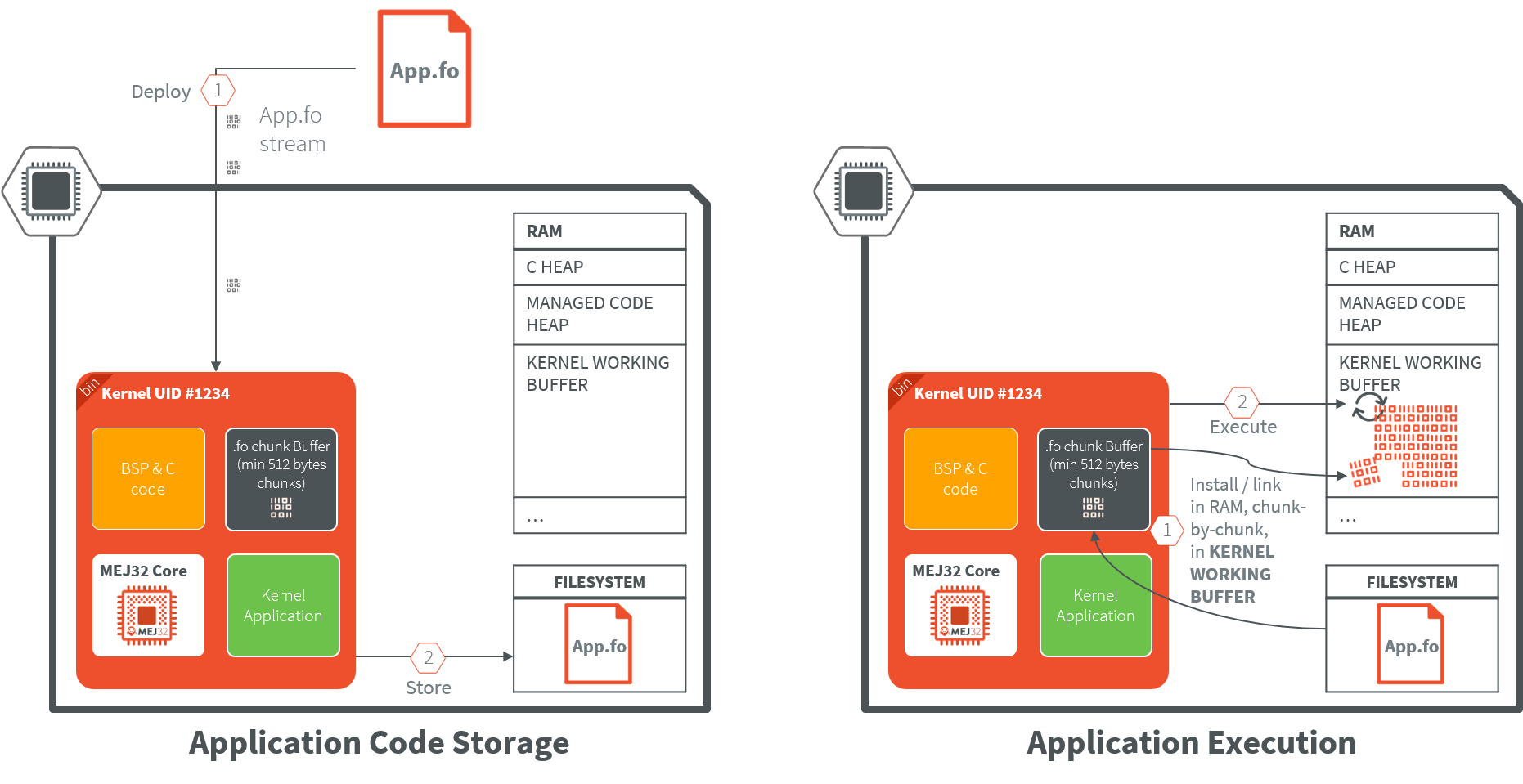 .fo) is stored as a persistent blob on a file system. It is then installed at a fixed execution address in the Flash memory map. Note that file system is optional in that case, the application can be directly installed in flash memory during deployment.Execution: The CPU fetches instructions directly from the Flash. Because the code is never moved, the original
